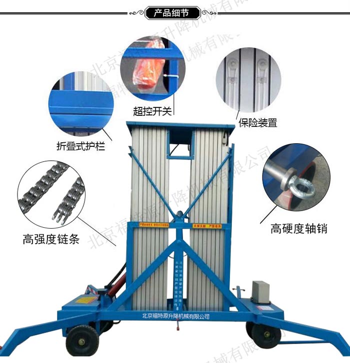 通常有單柱、雙柱、三柱、四柱、六柱等形式,根據需要可以加裝輔助行走裝置,為了放過通過低矮的通道可以定做為可斜式,還可以安裝到汽車、電瓶車等方便高空作業使用。