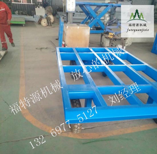 平板車一般采用實心輪胎,板面高度低、裝載量大。無破胎、爆胎的危險。安全、簡單而耐用。他自身無動力,需要又牽引車或者叉車來進行拖帶。通常由一輛或多輛平板車和一臺叉車或牽引車組成一列車輛來進行貨物平面運輸或大型設備的搬運工作。廣泛應用于機場、港口、火車站、工廠和大型倉庫。大大的提高了貨物中轉平移的效率。減少叉車和人力的消耗成本。