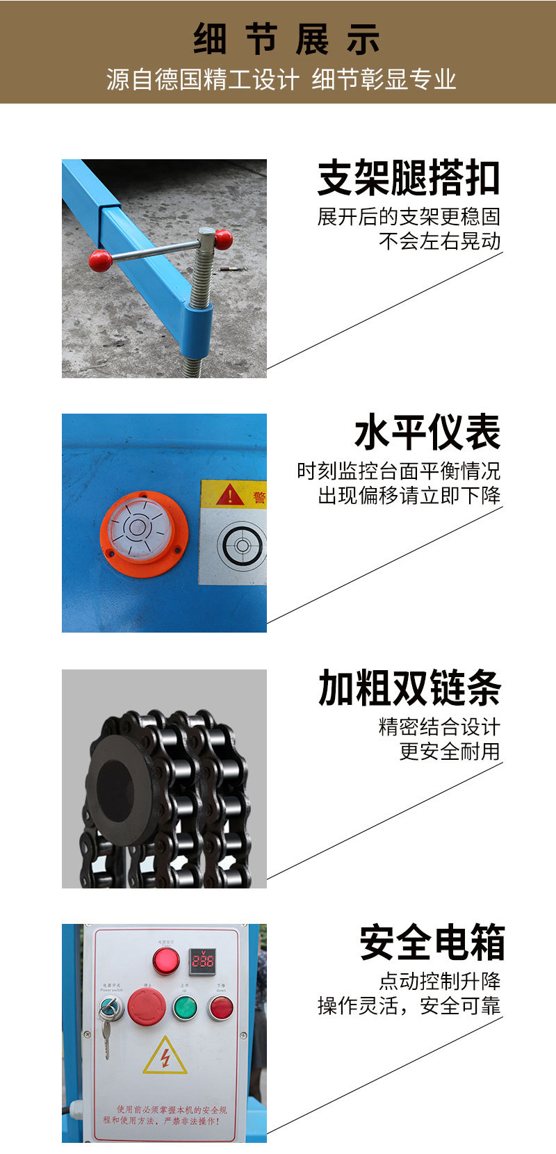 特點:采用高強度優質鋁合金材料,具有造型美觀、體積小、重量輕、升降平穩、安全可靠等優點。它輕盈的外觀,能在極小的空間內發揮最高的舉升能力。立柱升降系統,具有載量大,穩固性強,平臺面積大,推行方便等特點。