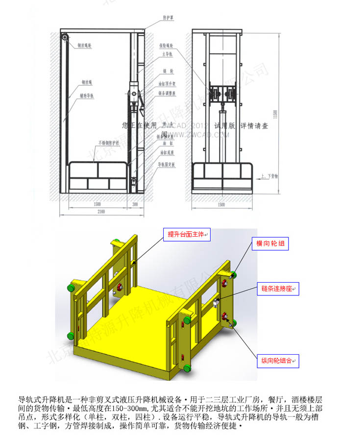 適用范圍:用于二三層工業廠房,餐廳,酒樓樓層間的貨物傳輸·高度在150-300mm,尤其適合不能開挖地坑的工作場所。